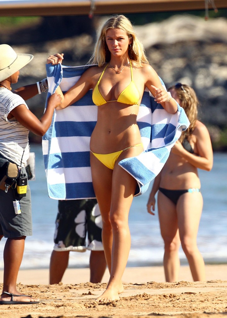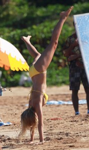Hot Celebrity Brooklyn Decker performs a cartwheel on the beach just for fun. Those around her cannot take their eyes off her hot body, they are carefully looking for an oops slip, they would be delighted to spot one. Even without an oops slip there is still some superb cameltoe on display for everyone’s enjoyment. Brooklyn gives us a Non Nude treat in her tight revealing bikini, especially by performing a cartwheel!