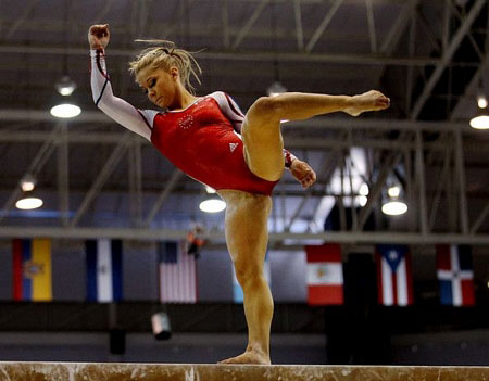 19yo Artistic Gymnast Shawn Johnson competes in the Pan American Games. She won a gold medal in the 2008 Olympic Balance Beam, and she was a Floor Exercise silver medalist, in 2007 she was all around world champion. She also recently won the eighth seacon of Dancing with the Stars. Anyway, so you get the idea, she’s very talented, one of the best at what she does, but I’m sure your just after the opportunity to gaze at her in a leotard for a bit, so feel free to get started if you haven’t already 😉