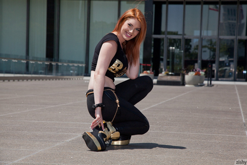 Zishy have called up red-head Lilith Lust for a sexy shoot, it’s an outdoor set with with a subtle tease which will please many passers-by. Here she is posing outside the John Ferraro building in downtown Los Angeles. Will she dare to show some skin, maybe just a hint of something naughty? Let’s see! To see the full photoshoot just head over to the official site HERE