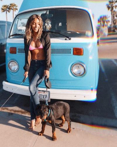 Sexy Californian girl on vacation with her dog Vegan hippie girl in a bikini smiling Vegan girl in a bikini Californian vegan woman relaxing in her bikini Californian vegan cutie with her dog Hippie girl covering her boobs with flowers