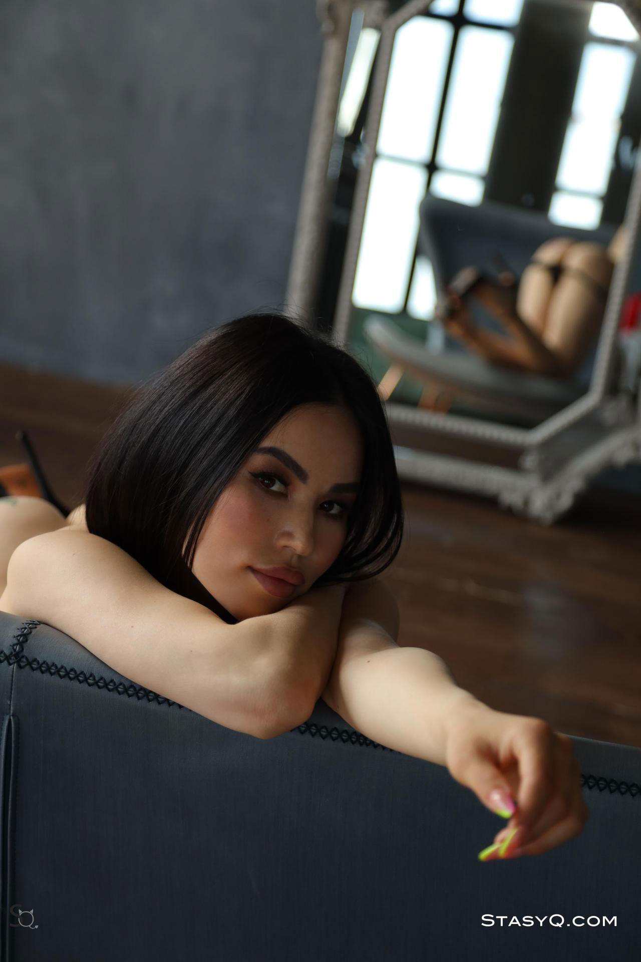 More now from the increasingly popular StasyQ collection and today we have a real treat for you. This is the adorable AiculQ who is a beautiful brunette with an amazing sexy figure who puts on a very stylish photo shoot and throws in some wonderful poses too. AiculQ looks very relaxed as she lays on the sofa then gives us our first treat of the session by lifting her black dress to display her amazing tushy. Later she stands in just her black bra and panties and squeezes her boobs together, then bends over with the reflection in the mirror behind showing her black panties pulled down. We then see AiculQ completely naked as she lays on the chair with a final treat of a nice view of her cute cherry tattoo on her right butt cheek. AiculQ is one of the many beautiful models they have on the StasyQ site and if you would like to see them or even the more revealing pictures of AiculQ that we couldn’t publish, then just click away at these pics and get yourself over to StasyQ. You’re going to love it !