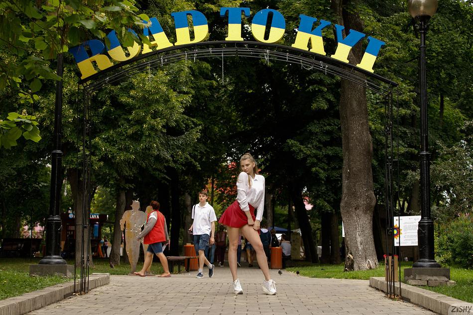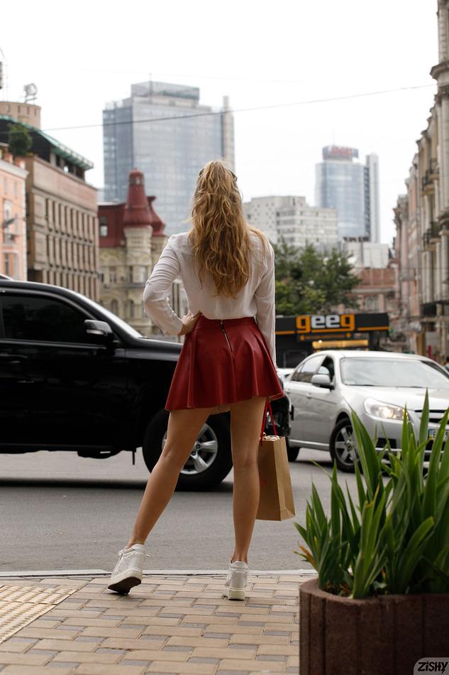 Hot Blonde Regan Budimir is having a nice walk through her city center today as part of her fabulous Zishy photo shoot, and she’s decided to throw in a few sexy poses along the way. First, she poses by a huge overhead sign then it’s off for a walk along the high street. As she stands by the road, she looks stunning in her white blouse and red mini skirt, but casual too in her white trainers. Regan then leans forward to give a very nice downblouse view then gets even more adventurous as she lifts up her skirt to give a wonderful close up of her skimpy pink panties and sexy star tattoos. Finally, as Regan bends over the iron railings by the road, she gives us one last amazing shot of her sexy hot ass. Regan Budimir is just one of the many hot models they have over on Zishy and to see more of her or the other stunning models just click on any of Regan’s pics below and head onto their amazing site. Feel free to become a member to see the naughtiest pics of all. Have fun!