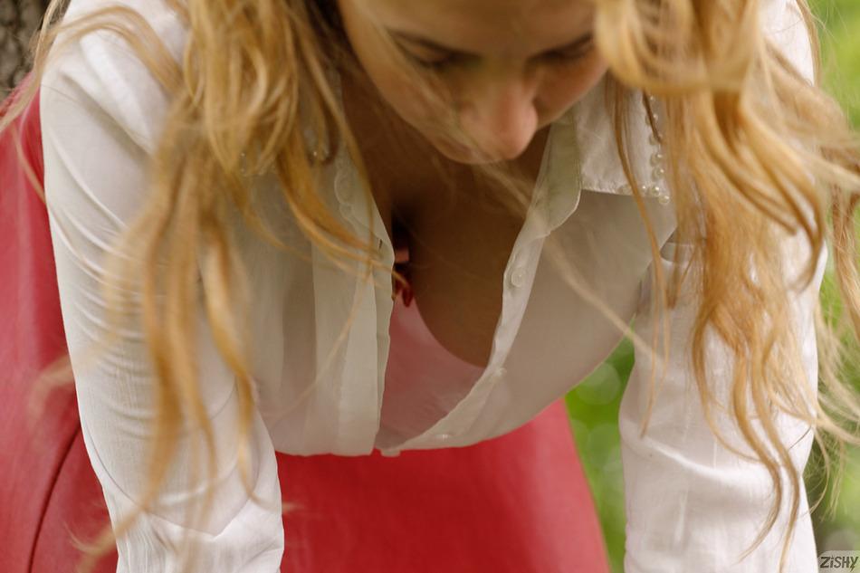Blonde Regan Budimir standing in her white blouse and red mini skirt outdoors for ZishyShe's standing by the road in her sexy red mini skirtBlonde girl leaning froward to give a nice downblouse viewUpskirt - Now she's giving a wonderful close up of her pink panties and sexy star tattoosCute girl bending over by the road to give a stunning upskirt view of her hot ass