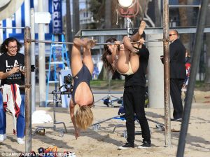 Both Sara and Hailey are enjoying their workout on the sand and swinging on the bars. Their tight skimpy swimwear means that there is always plenty on show, including tanlines peeking out now and again. The girls take a risk of an embarrassing oops wardrobe malfunction as they swing upside down on the bars. Everyone watching gets a real eyeful. If you’d like to see more of Hailey or other celebs just click on any of the pics.