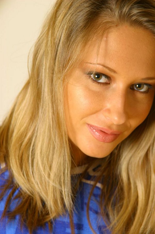 In the site you get to see a lot more of her, with a full strip tease This hot blonde is wearing tight clothes to show off her curves,